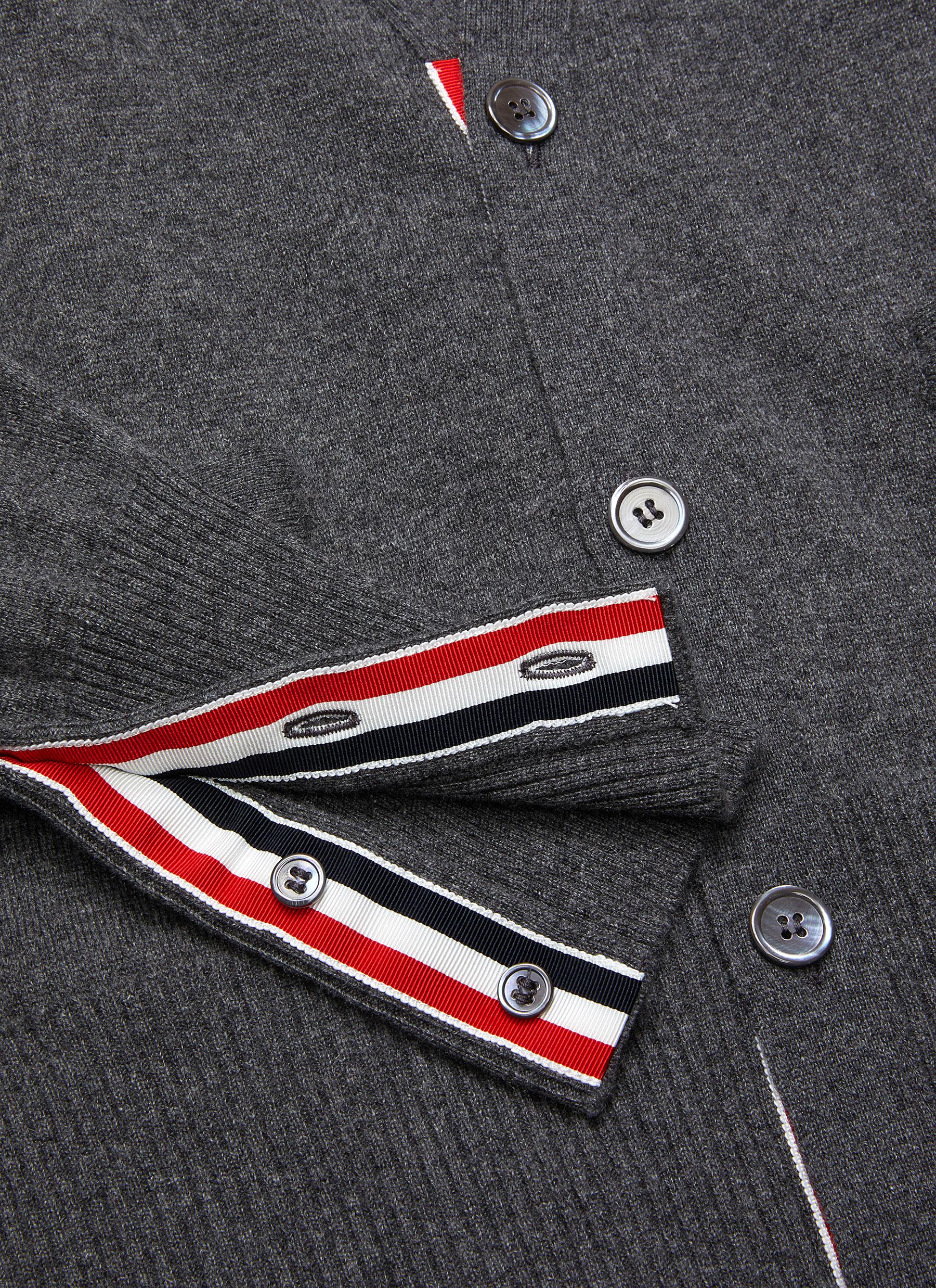 Front button closure with striped grosgrain placket