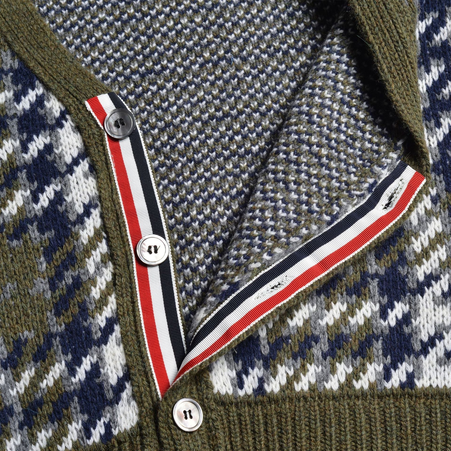 Front button closure with striped grosgrain placket